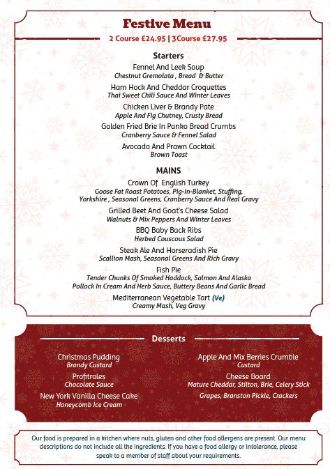 Christmas at The Compasses Inn Festive Menu Available 24th November to 24th December ADVANCED BOOKINGS ONLY 2 Courses £24.95 | 3 Courses £27.95 Book Now Festive Buffet Menu Available 24th November to 24th December ADVANCED BOOKINGS ONLY £19.95 per person | Choose Two | Available for a minimum of 20 people Book Now Christmas Day Menu Book your Christmas day celebrations with friends and family ADVANCED BOOKINGS ONLY 3 courses for £79.99 (including a Prosecco or Mulled Wine) Book Now Christmas Booking form Name *Email Address *Phone Number *Festive menu, Festive Buffet menu or Christmas Day *Festive menuFestive Buffet menu (min 20 people)Christmas DayDate for Festive menu *Festive Menu Time of arrival *Hours-120102030405060708091011Minutes-00153045AMPM12noon to 8pmChristmas Day Time of arrival *Hours-120102030405060708091011Minutes-00153045AMPM12noon to 4.30pmNumber of people for Buffet *Number of people *PrivacyWe value your privacy. Send Message